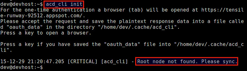 This will generate necessary OAuth credentials, which will be saved as a JSON file named “oauth_data”. Place this file in ~/.cache/acd_cli folder on the host where you ran acd_cli command, and press ENTER.