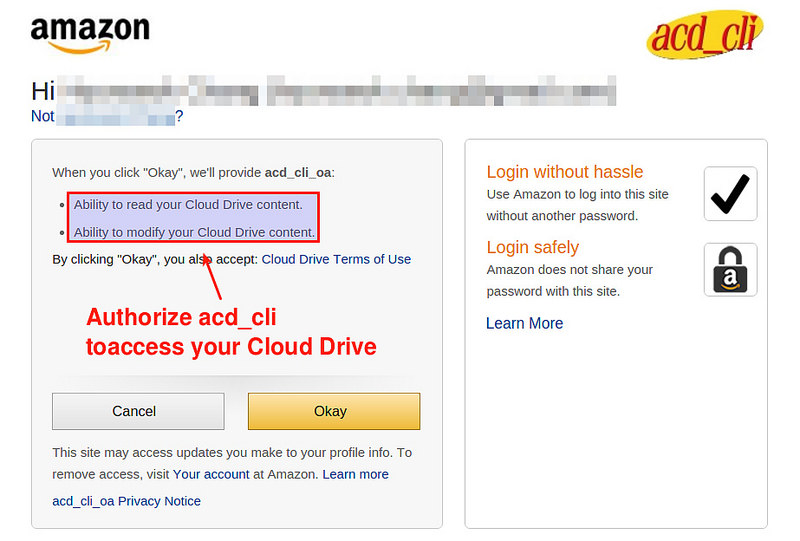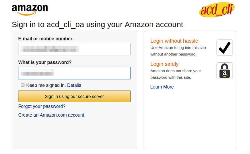 Type in your Amazon.com login credential, and you will be presented with a page where you authorizeacd_cli to access your ACD.