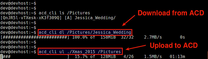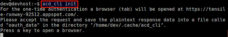 This completes the one-time setup of acd_cli. At this point, you should be able to access ACD from the command line.