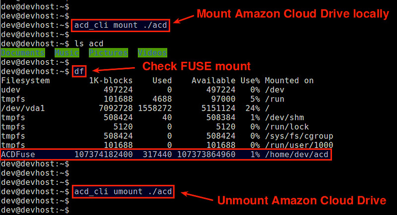 Now you can use native Linux commands (e.g., ls, df, cp, mv) to access your ACD account.