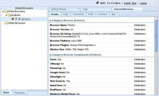 If I click on the local browser, it will provide with more choices to the right including a “Details” window where we can get all the particulars of that browser. Since I am using the Iceweasel browser built into Kali, which is built upon Firefox, it shows me that the browser is Firefox.