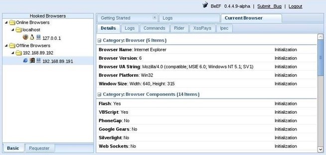 In the screenshot below, I have “hooked” an Internet Explorer 6 browser on an old Windows XP on my LAN at IP 192.168.89.191.