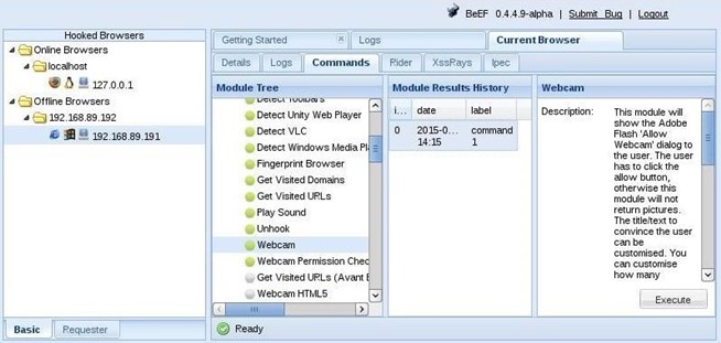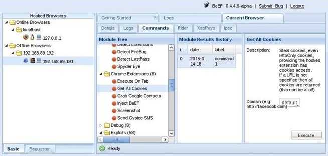 Now, that we have hooked the victim’s browser, we can use numerous built-in commands that can executed from the victim’s browser. Below are just a few examples; there are many others.