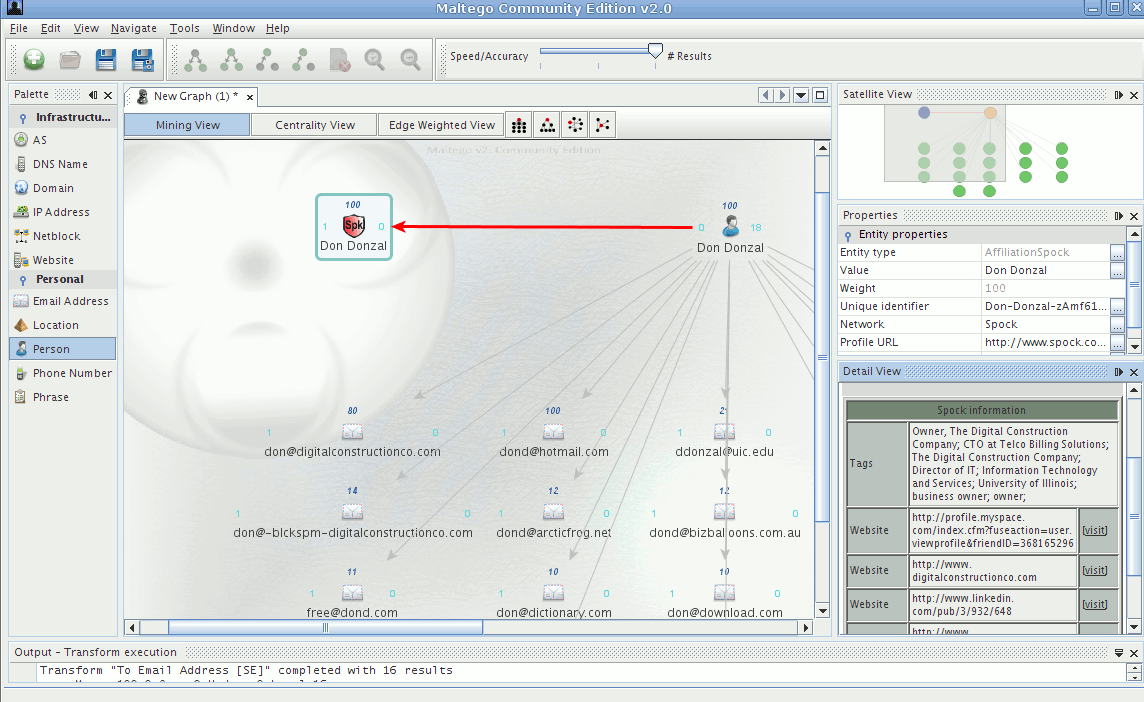 It appears Don hasn’t registered an email address tied to a PGP key, so nothing there. Email to common gave us one email address, of most benefit was using PersonToEmail_SE or Search Engine which gave us 16 results. You can see this in the Output-Transform Execution. I ran this transform without any additional search terms or country code.