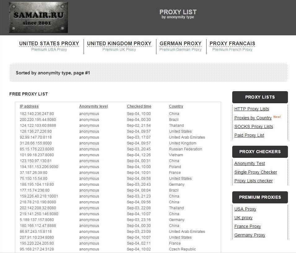 Let’s try using SamAir Security. When we navigate there, we can see their list of free proxies.