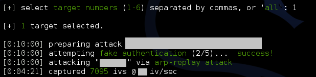You can also select all and then go take a nap (or maybe go to sleep). When you wake up, you might be hacking all the wifi passwords in front of you. I typed one and it had gathered 7000 IVs (data packets) within 5 mins. Basically you can except it to hack the wifi in 10 mins approx. Notice how it automatically did the fake auth and ARP replay.